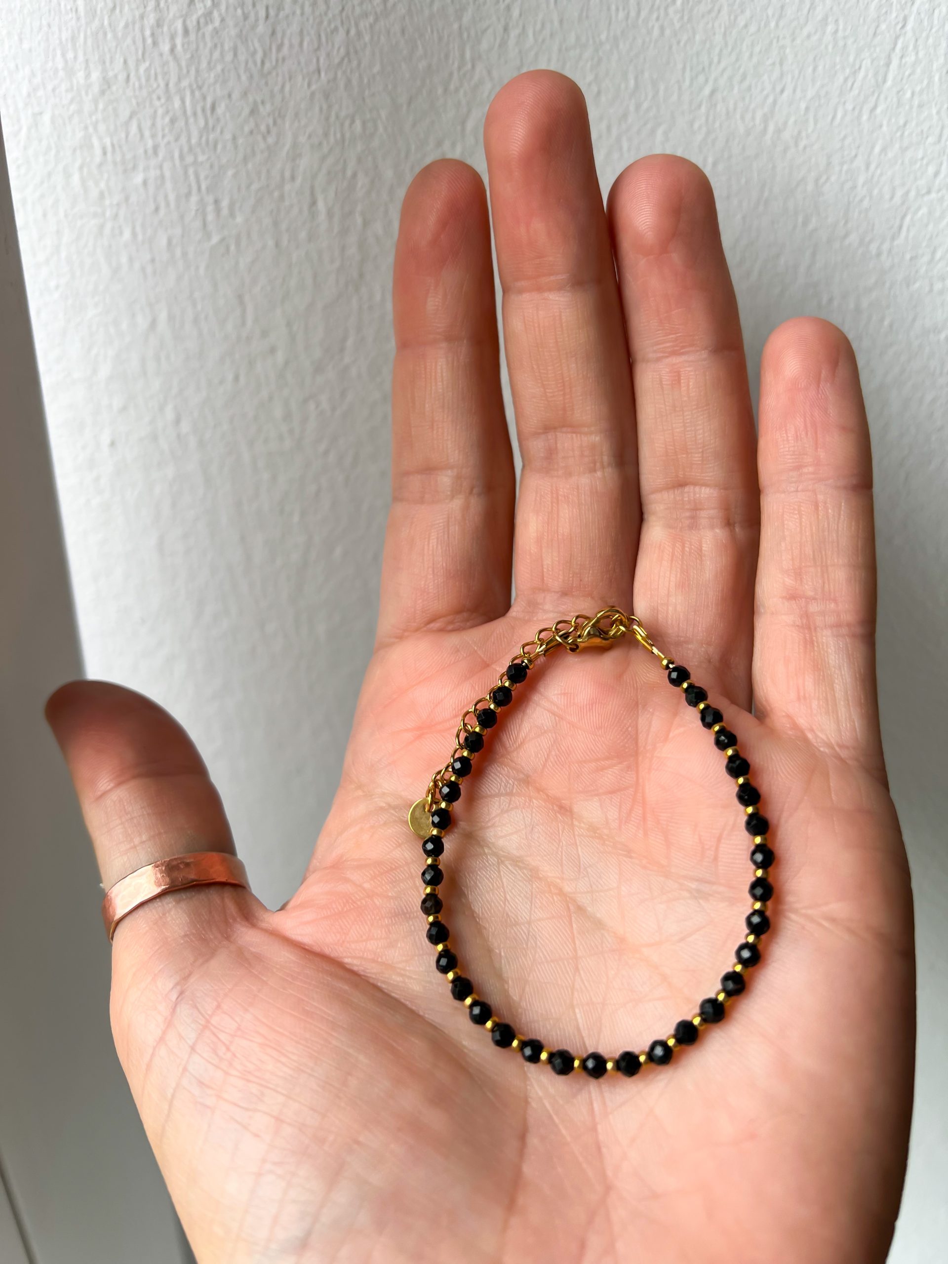 Subtelna w formie, potężna w działaniu – ta delikatna bransoletka z drobnych, 2-milimetrowych kamieni czarnego turmalinu to codzienny amulet ochrony i stabilności. Elegancka i minimalistyczna, pasuje zarówno do codziennych stylizacji, jak i na specjalne okazje, a jej energia będzie towarzyszyć Ci przez cały dzień.