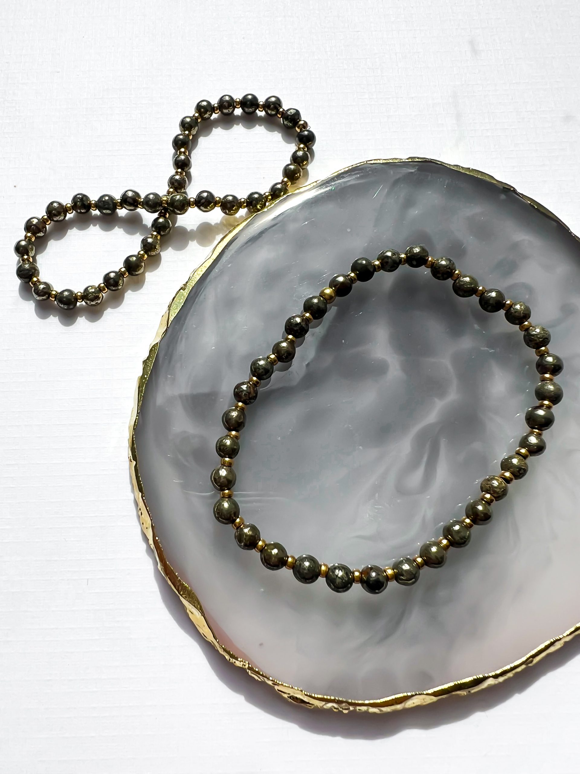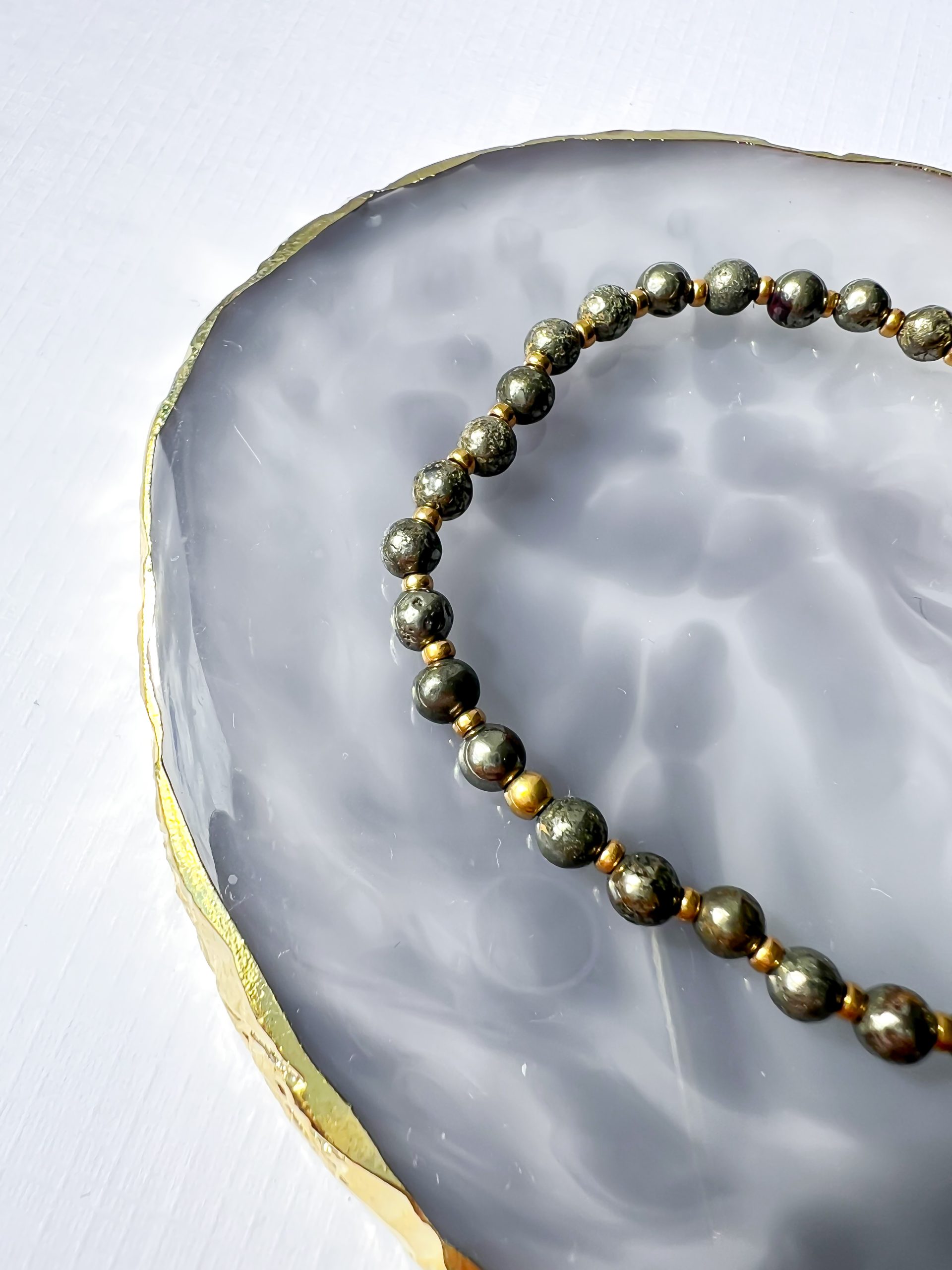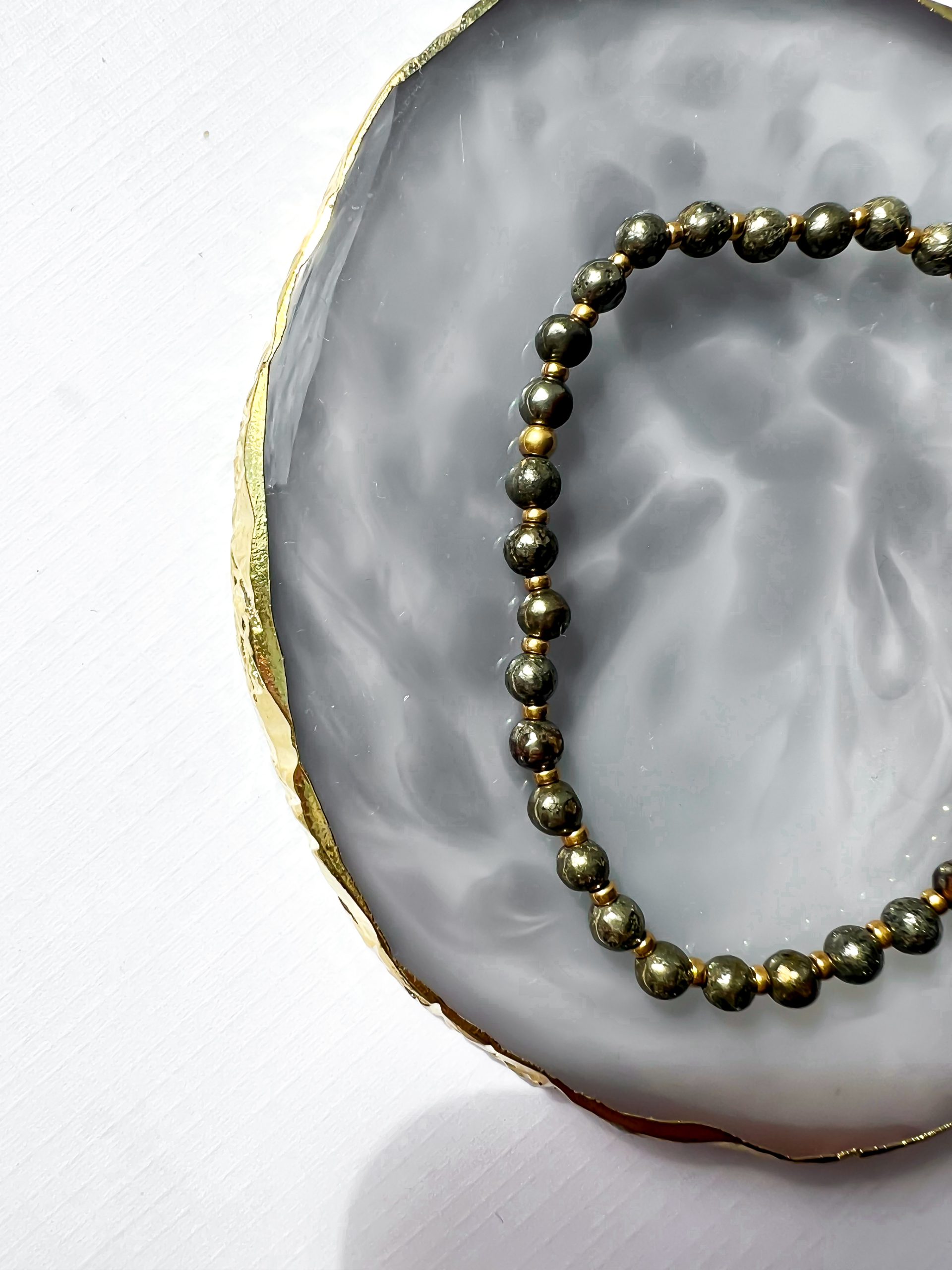 🌿 Materiały: Naturalny piryt (kulka gładka 4,5 mm), przekładki w kolorze złotym, elastyczna gumka