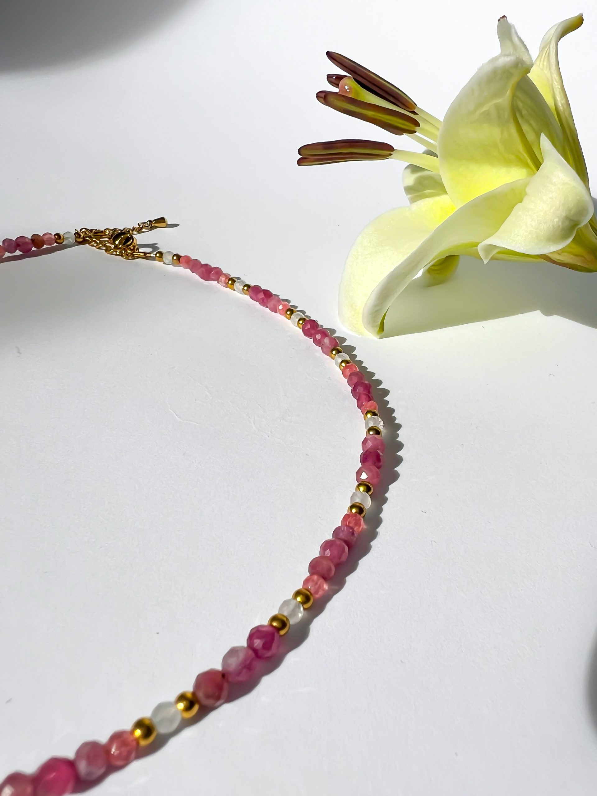 Połączenie turmalinu różowego, selenitu, jadeitu malinowego i kwarcu truskawkowego tworzy biżuterię pełną delikatnej, ale potężnej energii. Te naturalne kamienie wspierają harmonię emocjonalną, wprowadzają spokój i otwierają serce na miłość i pozytywne emocje.