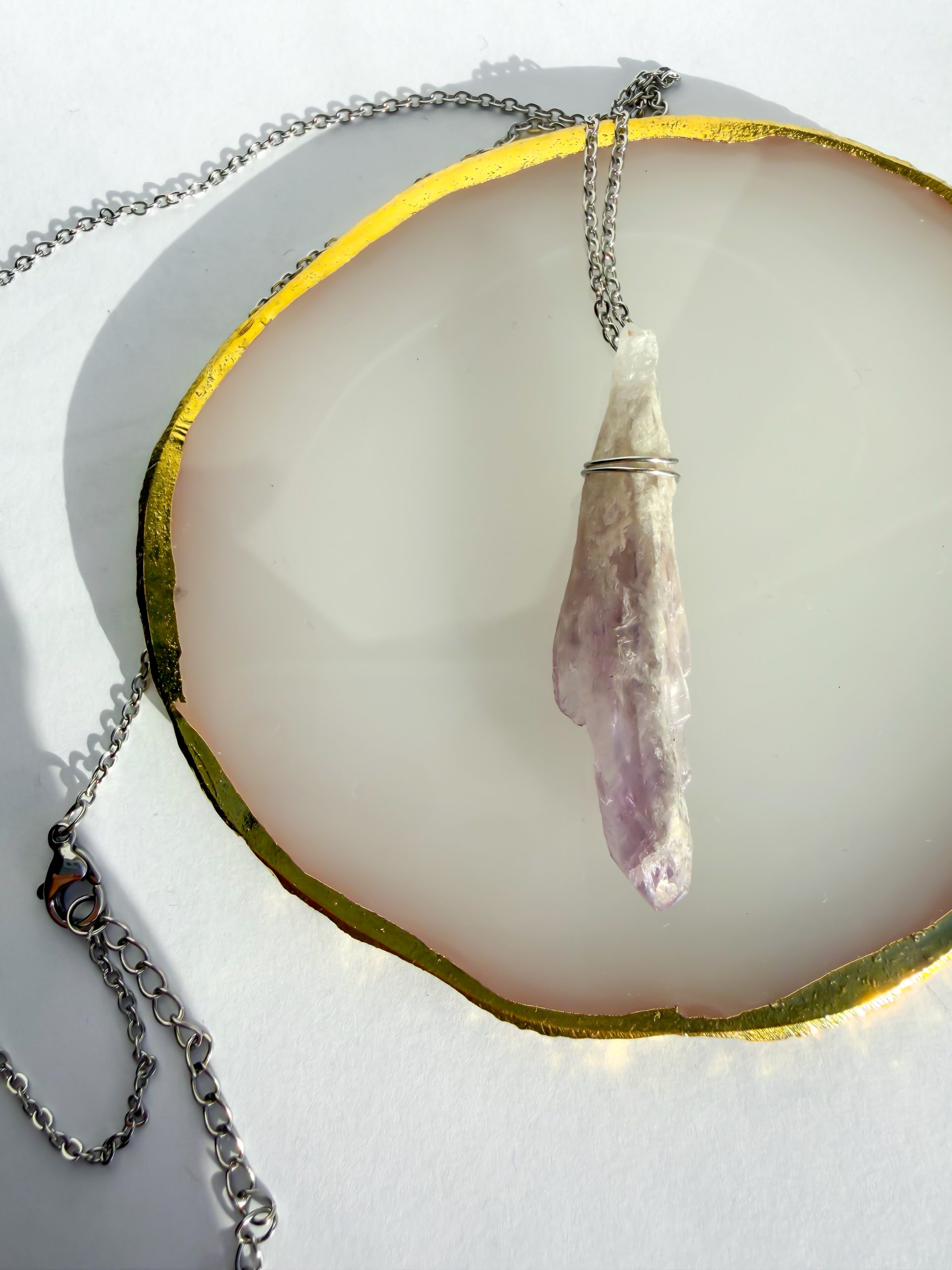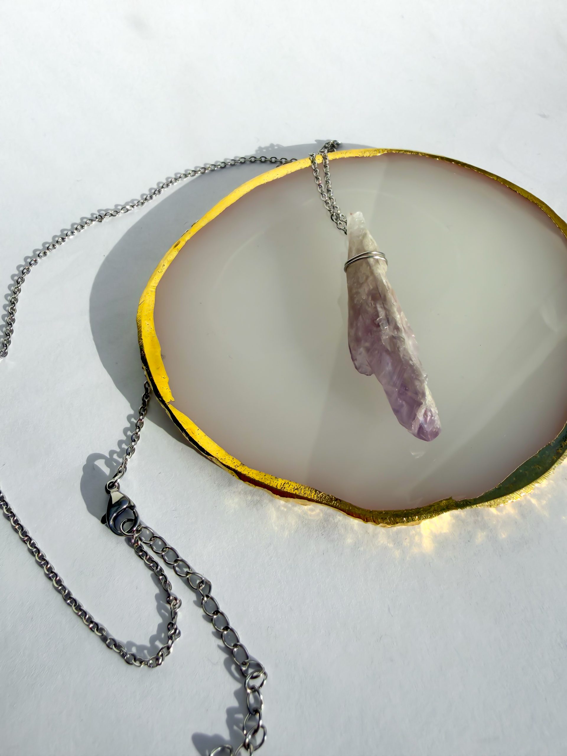 Zawieszka z ametystu zachowuje naturalny charakter kamienia. Każdy egzemplarz jest unikatowy – może różnić się odcieniem fioletu, strukturą i kształtem, co czyni każdy naszyjnik niepowtarzalnym.