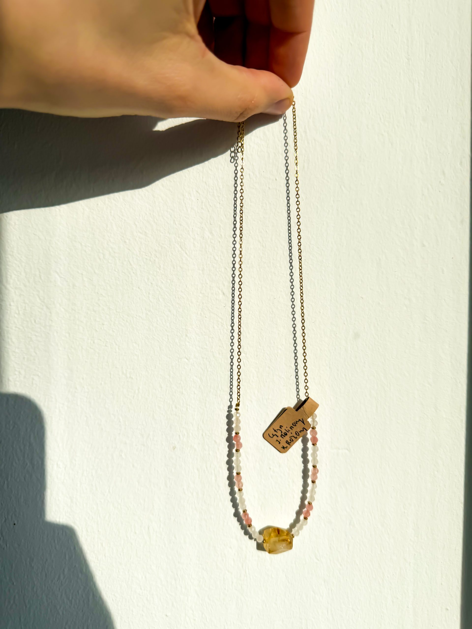 Bryłka cytrynu stanowi centralny punkt naszyjnika, a drobniejsze kamienie jadeitu malinowego i kwarcu różowego dopełniają całość subtelną, kobiecą energią.