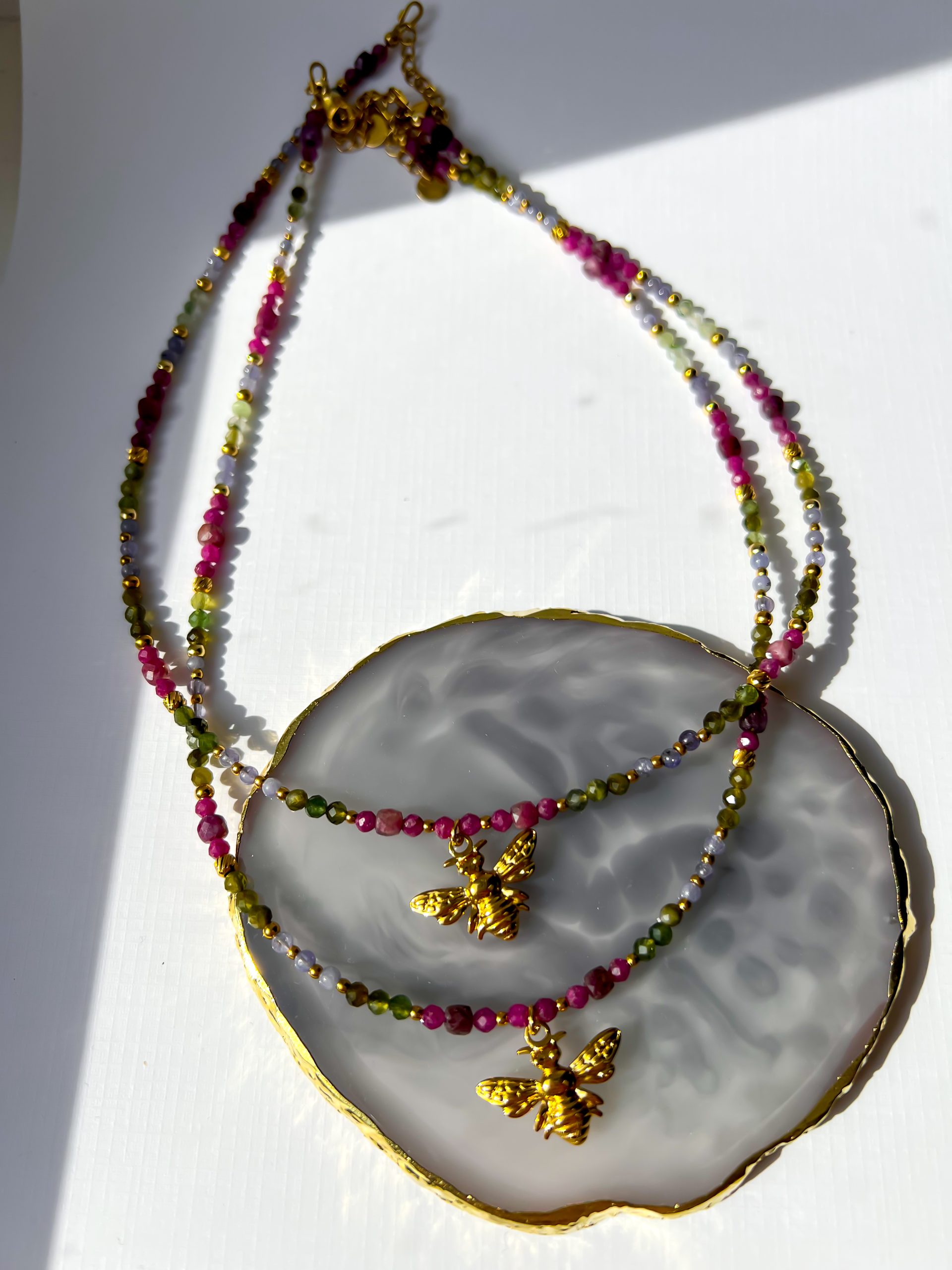 Naszyjnik wykonany jest ze stali szlachetnej pozłacanej – trwałej i odpornej na codzienne noszenie. Delikatne minerały w towarzystwie symbolu pszczoły sprawiają, że to biżuteria pełna nie tylko piękna, ale i głębokiego znaczenia.