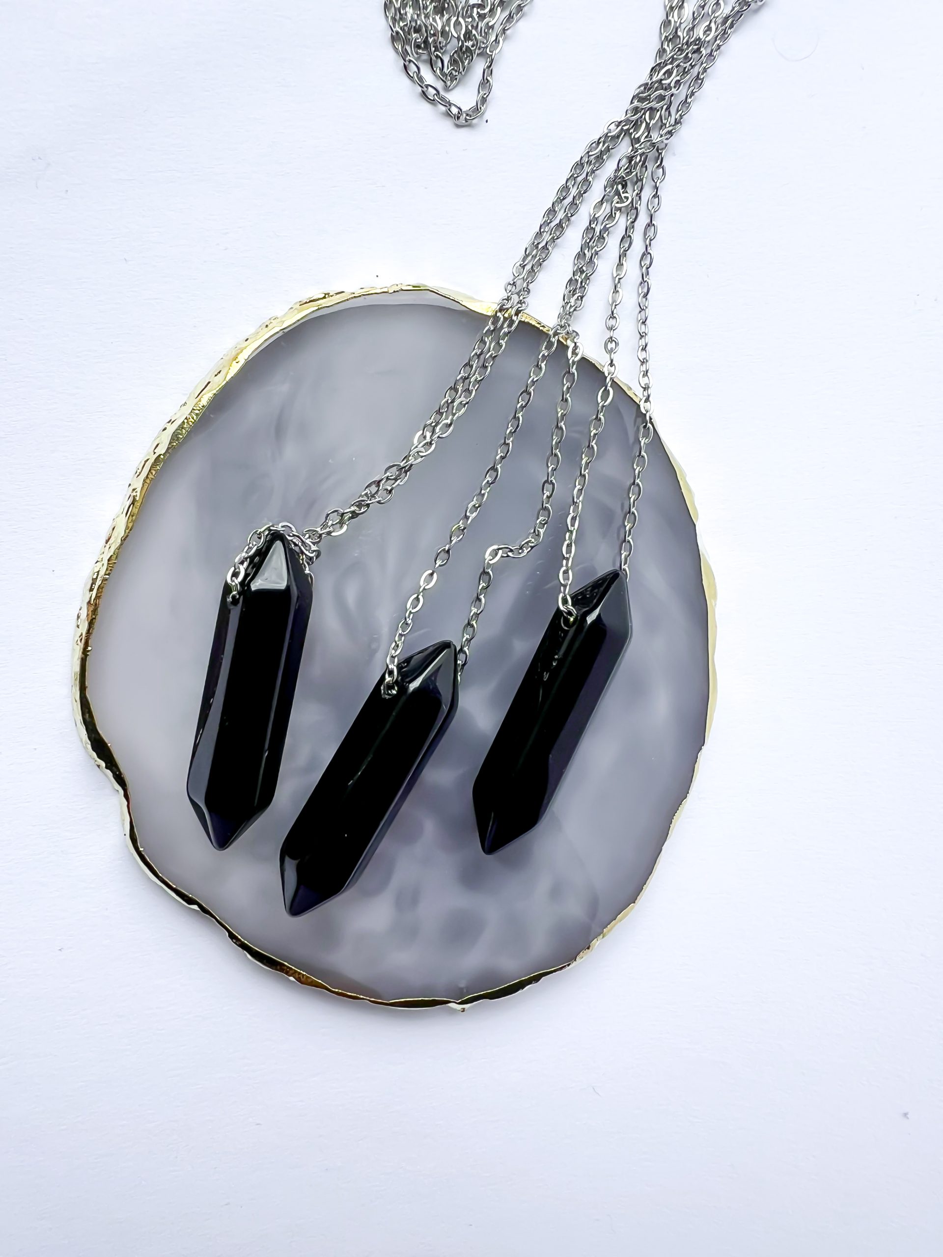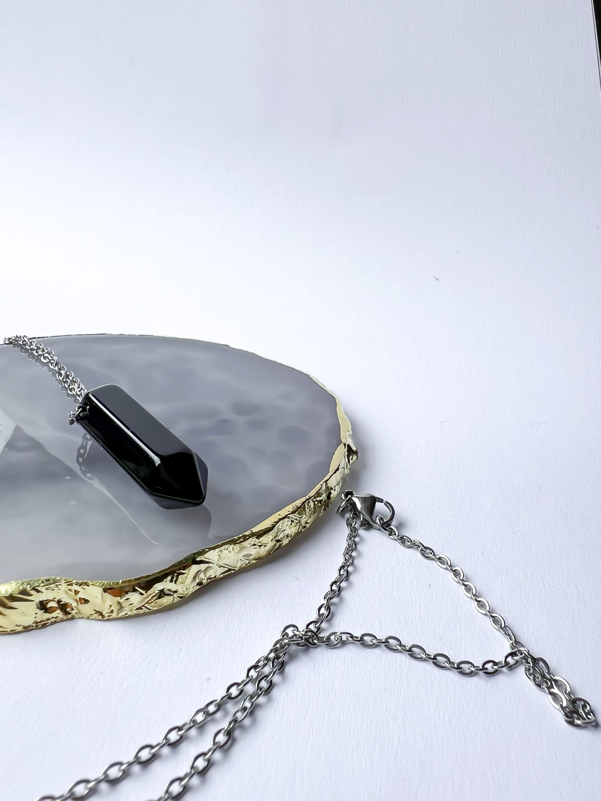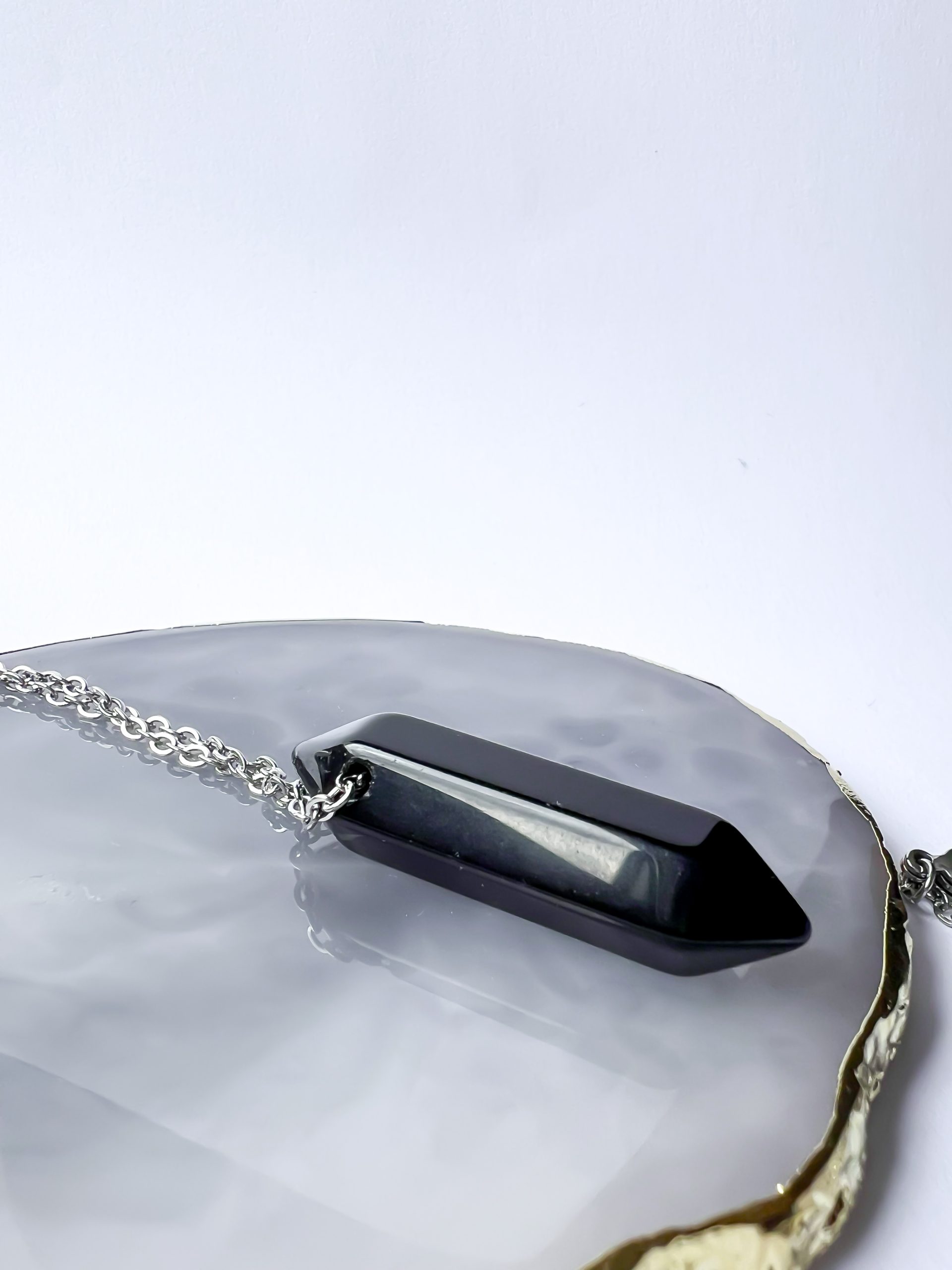 Zawieszka z czarnego, szlifowanego Obsydianu o formie podwójnego stożka – zawieszona na długim łańcuszku ze stali szlachetnej – to esencja ochrony, mocy i kontaktu z własną prawdą. 🌌✨